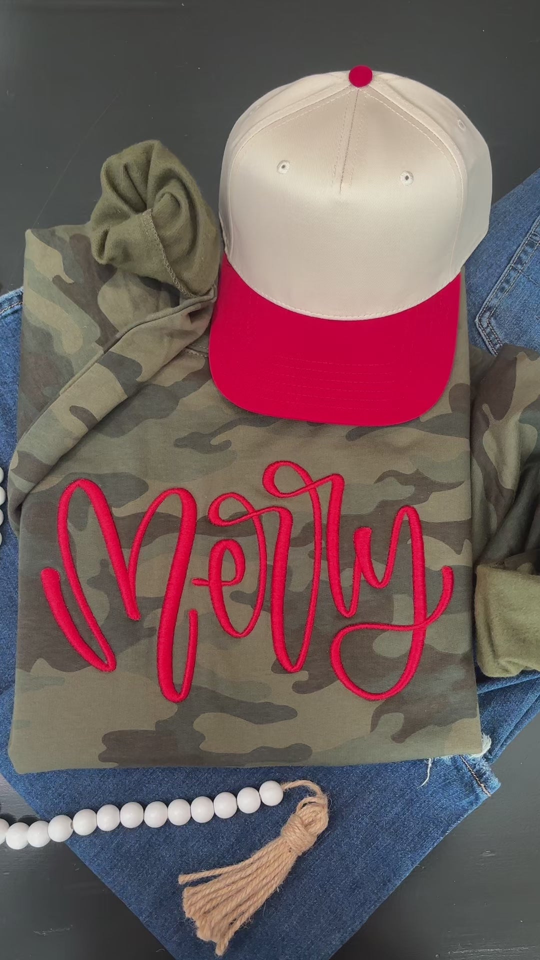 Celebrate the season with a little edge! This camo sweatshirt features bold 3D puff embroidery in vibrant red thread, giving the word “Merry” that perfect raised, high-end, boutique look. Cozy, festive, and impossible to miss — it’s the one you’ll reach for all December long.