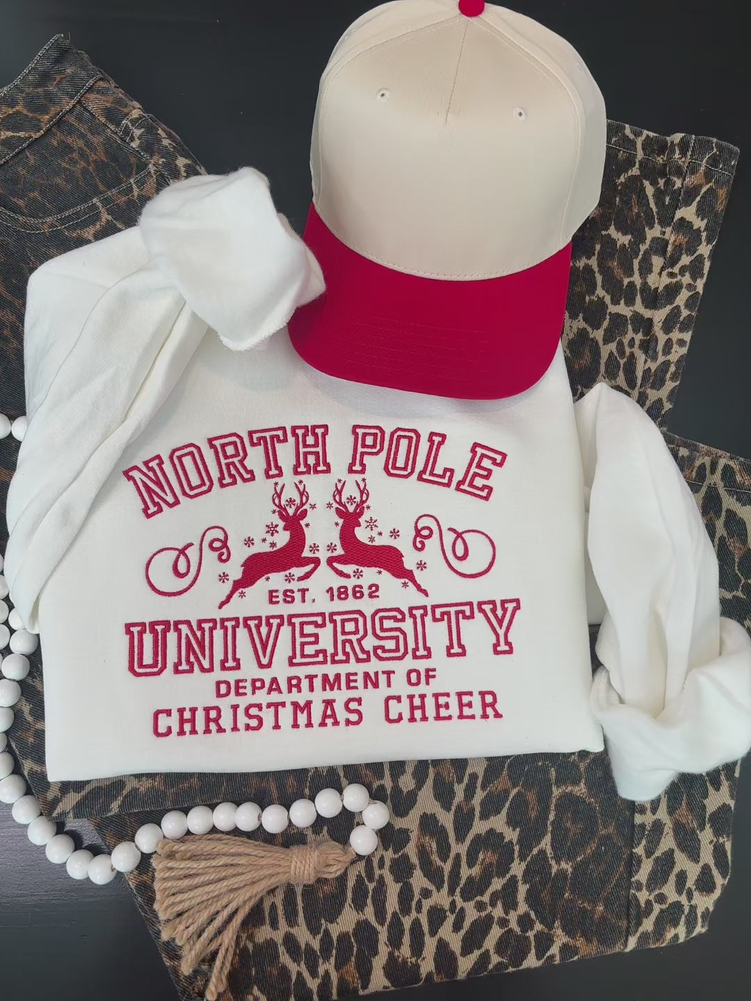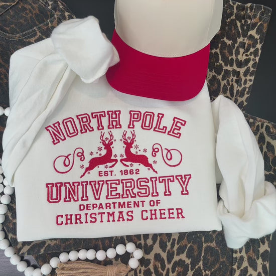 Enroll in the coziest “college” of the season with our North Pole University embroidered sweatshirt! Perfect for anyone who loves whimsical, classic Christmas vibes, this design brings a fun collegiate twist to your holiday wardrobe.